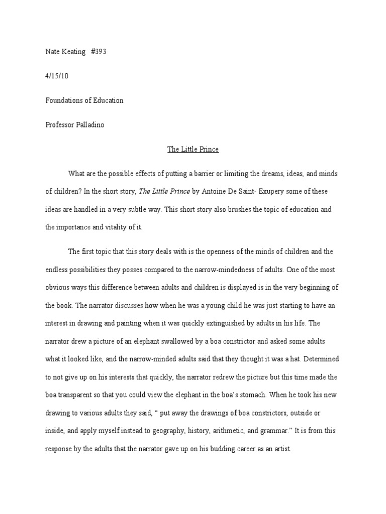 Nov 21, · How long does a five paragraph essay take? - short essay on chhath puja:: Essay about covid 19 words. Ratings. 77 % (55) How long does a five paragraph essay take? - The Little Prince essays are academic essays for citation. These papers were written primarily by students and provide critical analysis of The Little Prince by Antoine de Saint-Exupery. Disguised Imperfections: Human Nature in "The Little Prince," "The Mirror Maker," and "The Nose" Matters of Consequence in "The Little Prince": Comparing Frankly I didn’t have too Essay About Little Prince much expectation earlier but it blew my mind when i saw my assignment. Too much professionalism and exactly how i wanted. I think 5 stars are less for your work. Hats off to you Essay About Little Prince guys. Looking forward to order again